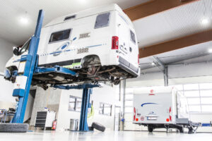 Wohnmobil auf Hebebühne in der Werkstatt